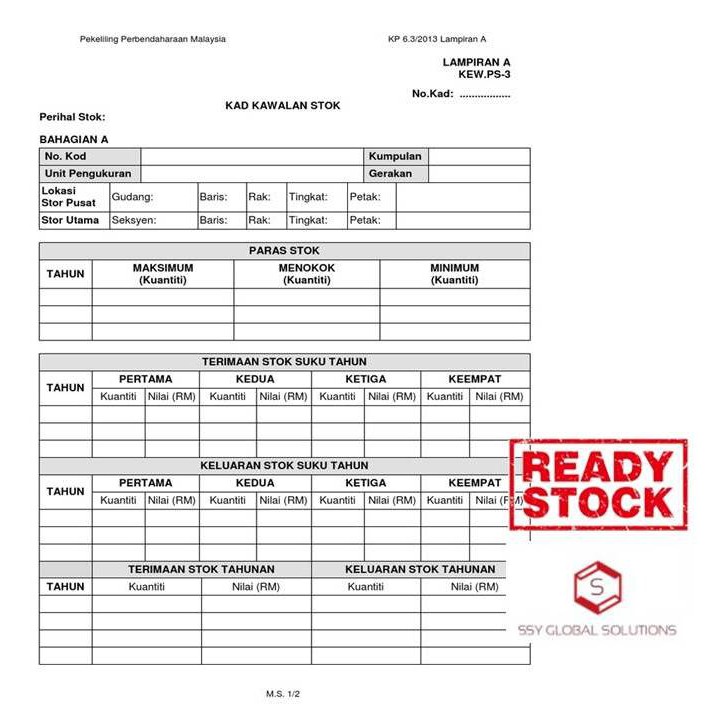 Pekeliling perbendaharaan malaysia am 6.3 lampiran a . Kew ps 3 daftar stok. Kad kawalan stok (tatacara pengurusan stor 53) perihal stok: 8 kew ps 3 kad kawalan stok.